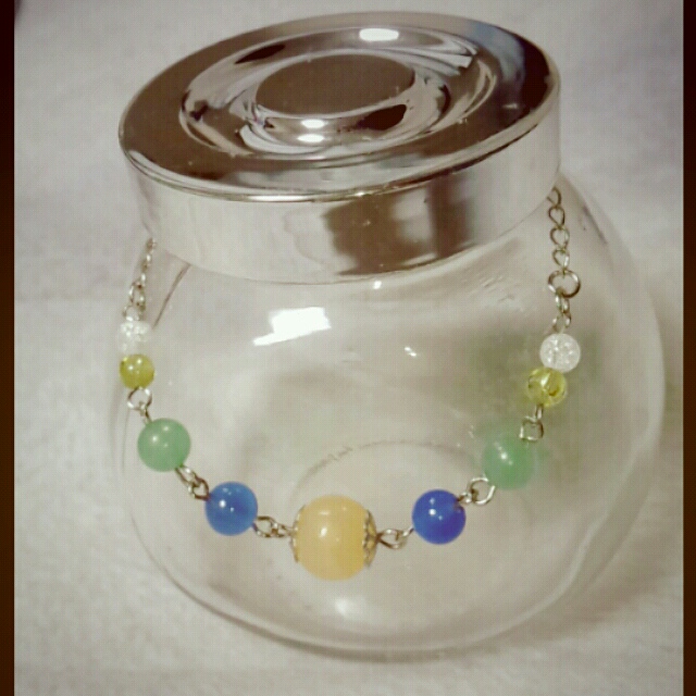 アラゴナイト(柔軟な思考、プラス思考に変える)・青めのう(魔よけ、集中力を養う)・クラック水晶(7つの光が願いを叶える)・ペリドット(聡明さを与える、恐怖心を取り除く・8月の誕生石)・・・青めのうの隣の緑の石は名前忘れた。
